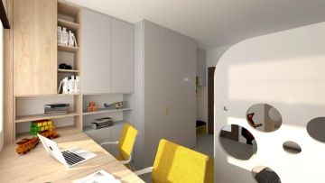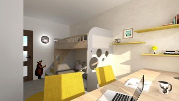 Jak jsme si poradily s dětským pokojem 12m2 pro dvě malé děti v Praze? Ondrášek a Adélka potřebují komfortní postele, úložné prostory na oblečení a na hračky, psací stůl s židlemi, knihovnu a věšák na oblečení. Studenou zeď u postelí jsme zateplily korkovým obkladem ve světlé barvě. Děti mají rádi žlutou barvu, v kombinaci s šedou a dřevem nemůžete udělat chybu