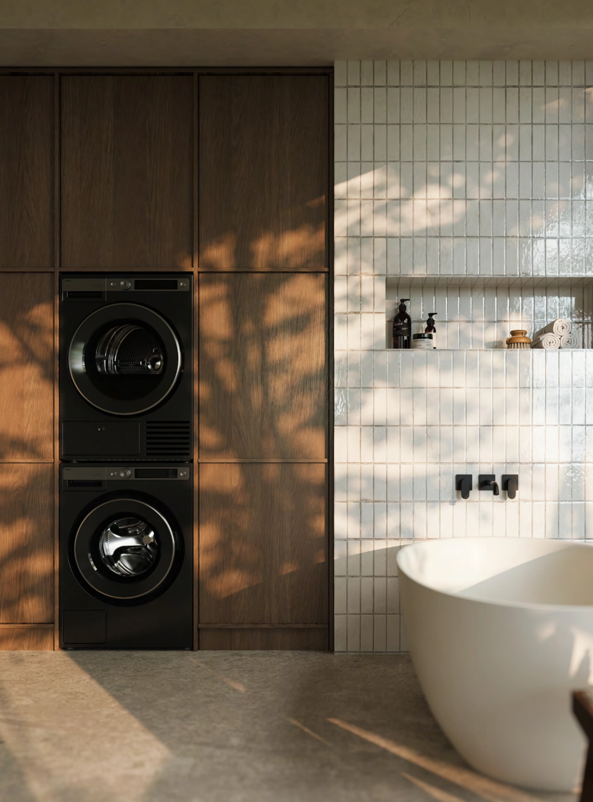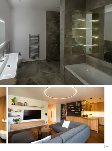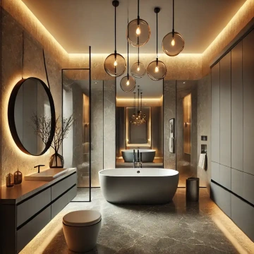 Matný mramor, volně stojící vana, závěsné skleněné osvětlení a šedé úložné prostory – tato koupelna vás pohltí elegancí a klidem. Místo, kde můžete zapomenout na svět venku a užít si chvíle jen pro sebe.