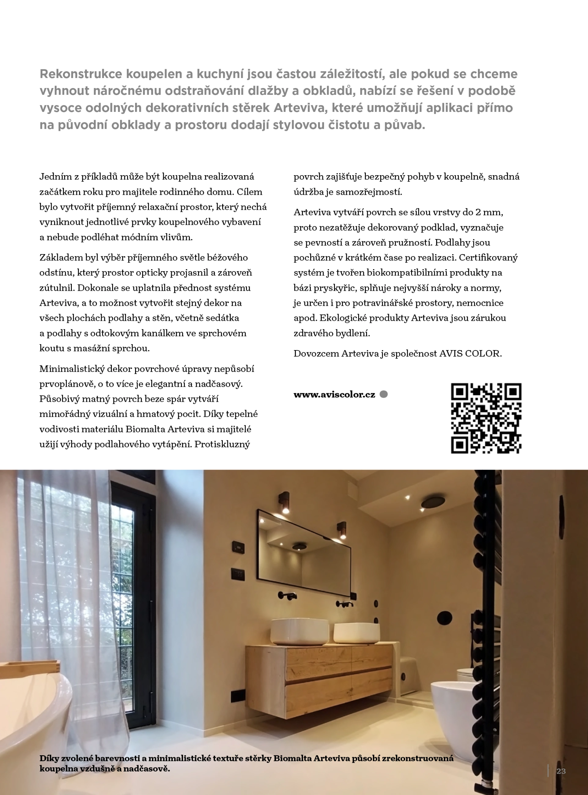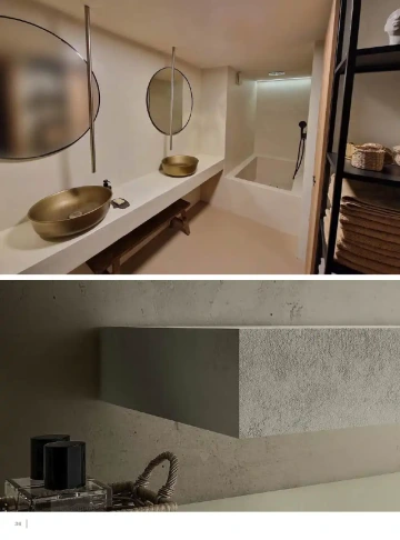 Betonová a dekorativní stěrka v koupelně je funkčním a designovým řešením stěn a podlah. Do koupelny používáme stěrku Magic Touch od Zera a nebo systém materiálů od společnosti Arte Viva. Na obklad je nutné nanést kontaktní můstek. My doporučujeme Fondo Rete, které krásně zakryje spáry a plocha je pak nádherně jednotná.