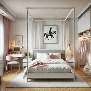Při zařizování tohoto pokoje jsme mysleli na vše, co je pro mladou dámu důležité. Canopy postel dodává místnosti eleganci a pohodlí, zatímco moderní psací stůl nabízí ideální místo pro studium nebo kreativní chvíle. Vestavné skříně zajišťují dostatek úložného prostoru, aby vše zůstalo organizované a přehledné.