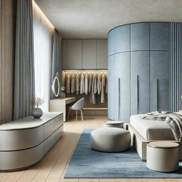 Představujeme moderní ložnici, kde se snoubí čisté linie, jemné tóny a sofistikovaný design. Béžové kulaté noční stolky, stylový toaletní stolek s kulatým zrcadlem a modrá stěrka Magic Touch vytváří harmonický prostor plný klidu a elegance.