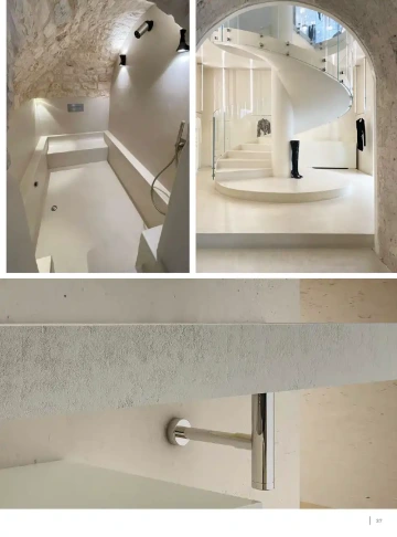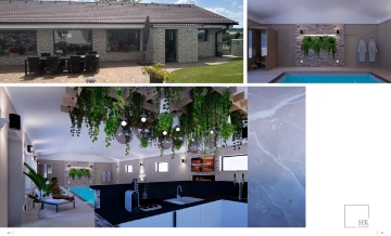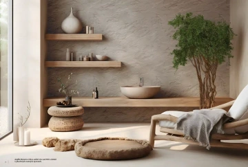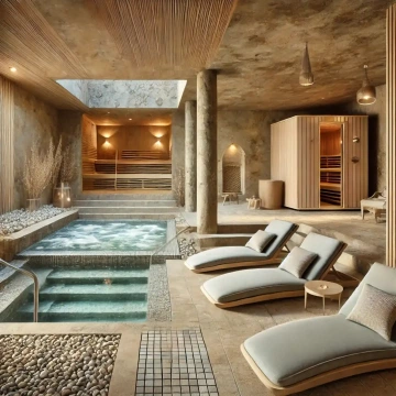 Přírodní tóny, kamenné stěny a jemné stěrky vytvářejí útulnou atmosféru, zatímco brouzdaliště a malé sezení pro občerstvení doplňují zážitek. Protiskluzová dlažba zajišťuje bezpečnost i komfort.