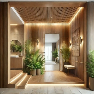 Při vstupu do domu vás okamžitě obklopí příjemná atmosféra dřeva a elegance. Dřevěné lamely dodávají prostoru sofistikovaný rytmus, zatímco svěží zeleň přináší do interiéru život. Dominantním prvkem je velké zrcadlo, které nejen opticky zvětšuje prostor, ale také odráží jemné světlo, čímž vytváří hřejivou a přívětivou atmosféru. Celkově hala působí moderně, elegantně a přitom přirozeně, což z ní činí ideální uvítací prostor. Schodiště, které navazuje na vstupní halu je elegantní, se zaměřením na osvětlení a jemné dřevěné akcenty. Abstraktní obraz přináší moderní umělecký prvek.