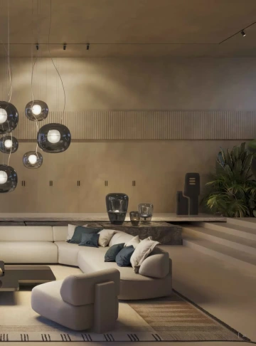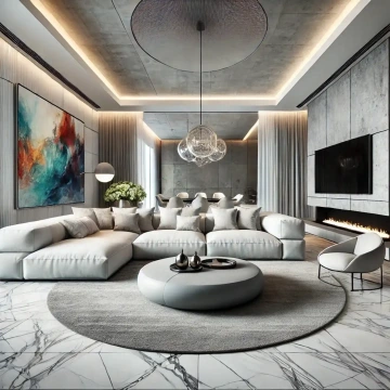 Tento luxusní obývací pokoj spojuje eleganci s maximálním pohodlím. Dominantní sedačka vytváří ideální místo pro relaxaci. Velkoformátová bílá mramorová dlažba dodává prostoru sofistikovanost, zatímco šedý kamenný kulatý stolek a kruhový koberec podtrhují harmonii interiéru.