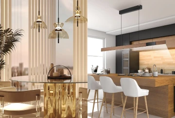 V tomto luxusním a světlém interiéru byla barva roku Mocha Mousse použita na několika klíčových místech: