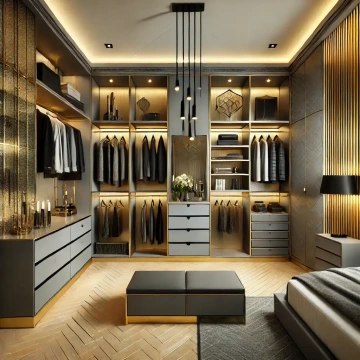 Tento prostor je ideální pro každého, kdo touží po perfektně organizovaném místě pro své oblečení, doplňky a šperky.