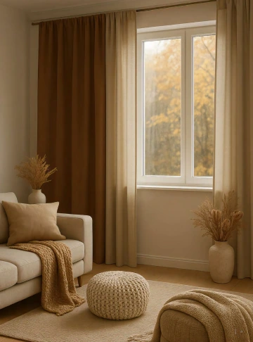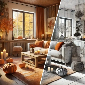 Podzimní interiér obývacího pokoje s kombinací skutečné realizace a 3D vizualizace. Skvělá inspirace, jak přivést nápady k životu od návrhu až po hotový prostor. Interiéry HK Příbram. Nakreslíme, poradíme, zařídíme.