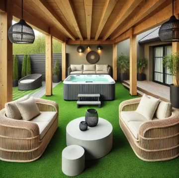Při zařizování této terasy jsme vsadili na spojení přírodního vzhledu a pohodlí – travní koberec dodává svěží zelený základ, ratanové sezení se světlými polstry zve k posezení a hladký betonový stolek doplňuje moderní vzhled. Vzadu relaxuje vířivka, vše pod dřevěnou pergolou se závěsným ratanovým osvětlením a svícny z černého kovu. Večery tady prostě milujeme!
