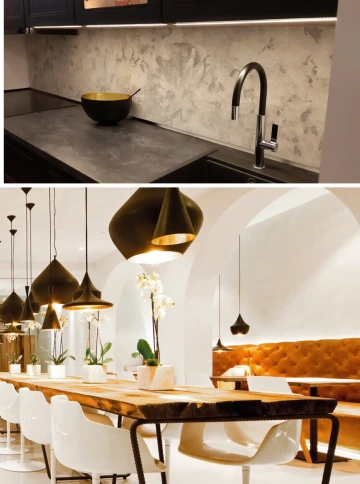 ✔ Některé stěny nebo dekorativní panely – jemně ladí se zlatými a světlými akcenty.