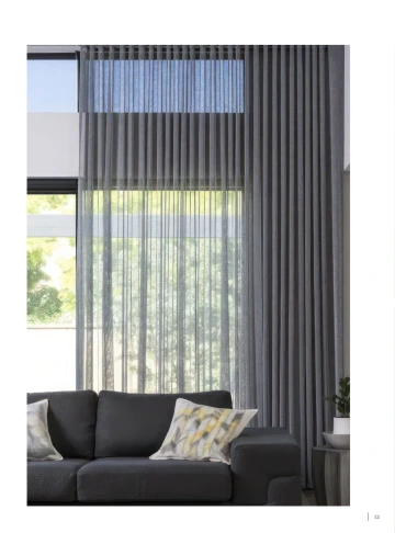 Luxusní šedé závěsy a jemný modrý koberec pro útulnou atmosféru