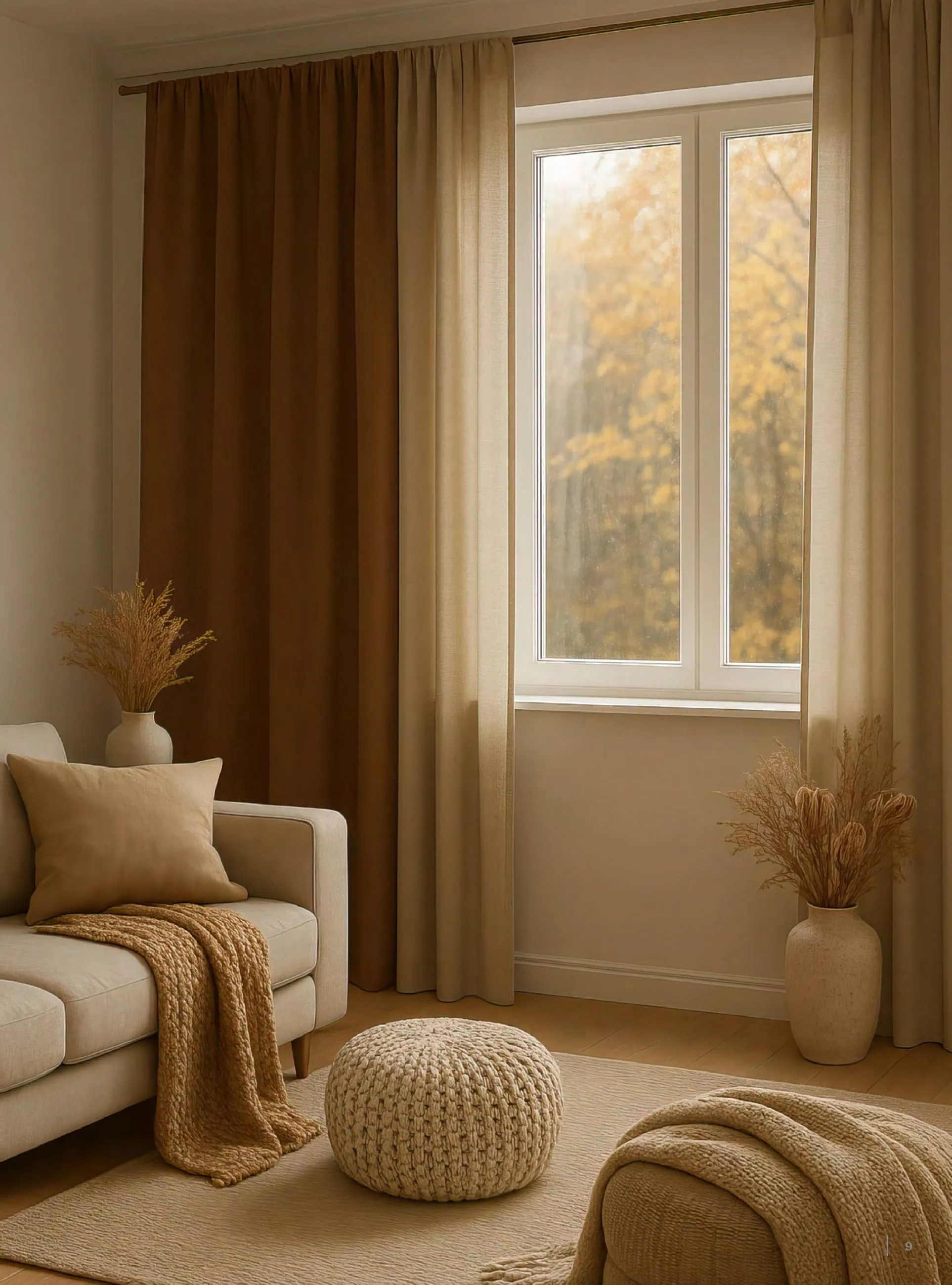 ✔ Koberec v teplých tónech Mocha Mousse – přidává hloubku a vizuální komfort.