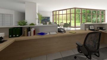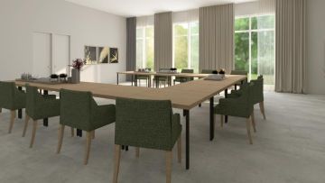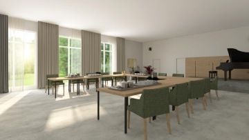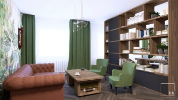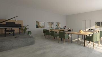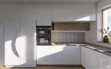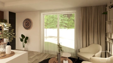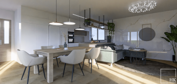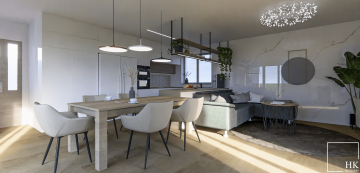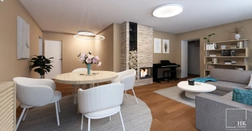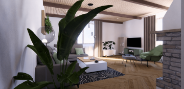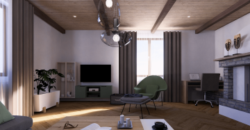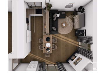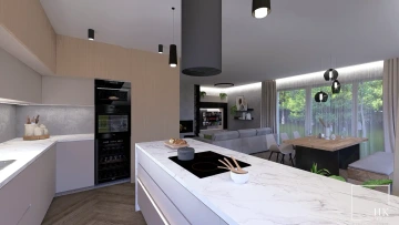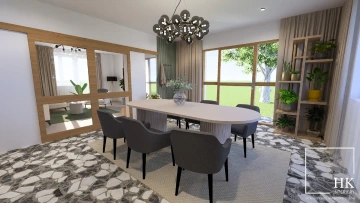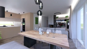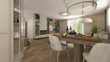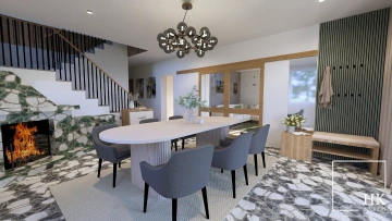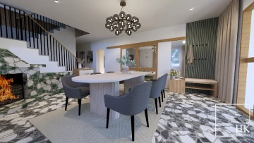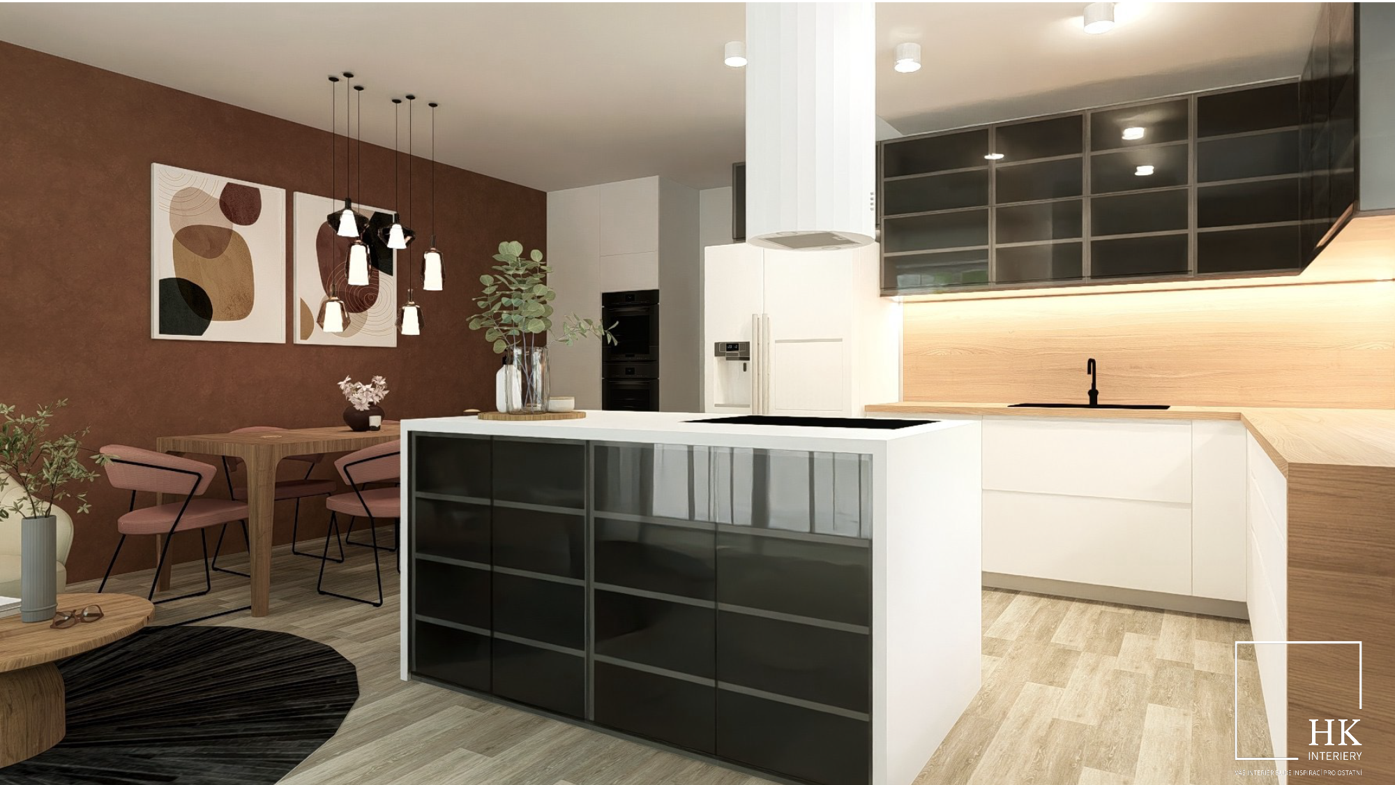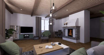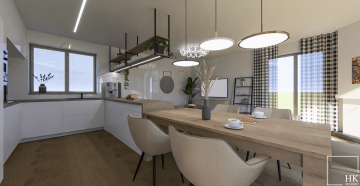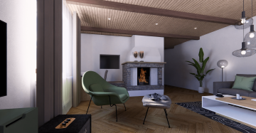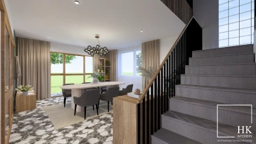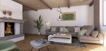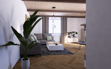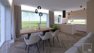 Představujeme vizualizaci interiéru rodinného domu, který dokonale propojuje přírodní materiály a moderní design.