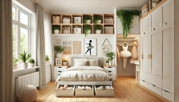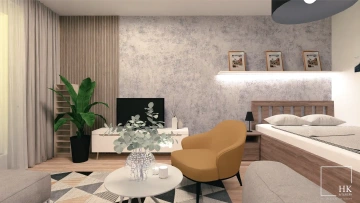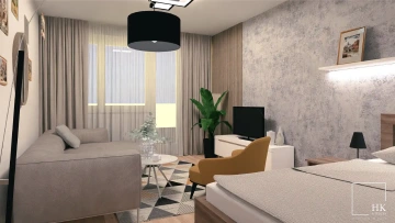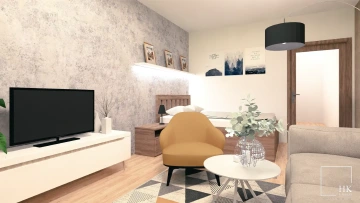 Obývák a ložnice v jednom: Multifunkční prostor zahrnuje pohodlné sezení pro relaxaci, čtení a sledování TV.