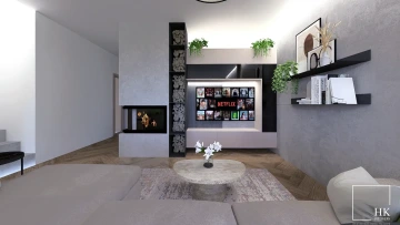 Elektrický krb a TV, které dodávají místnosti nádech moderního komfortu.