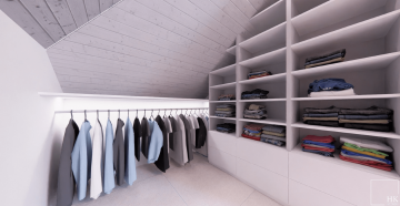 Praktické úložné prostory na ručníky a prostěradla umístěné hned vedle sauny a malé toalety – vše po ruce pro váš maximální komfort.